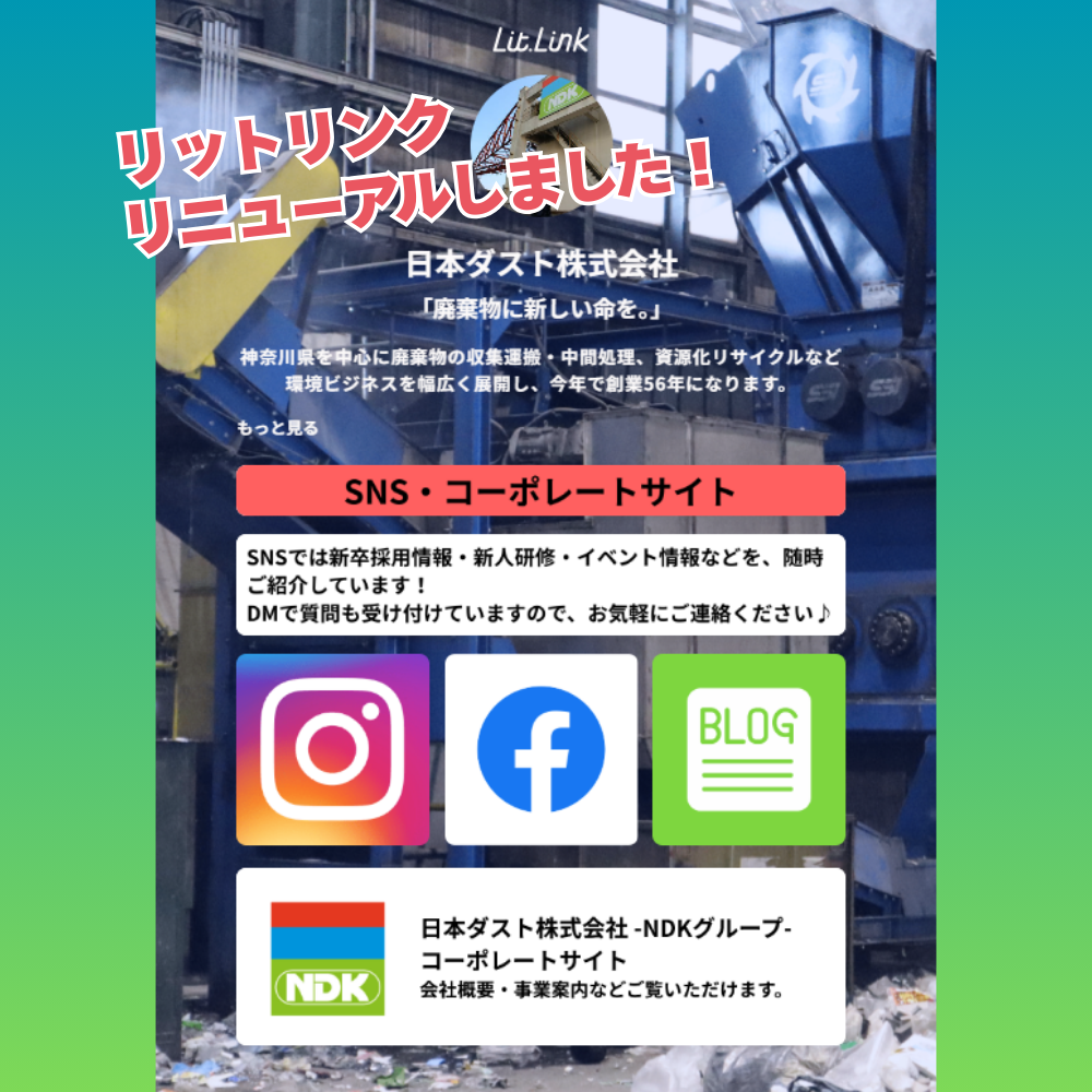 リットリンクでは、弊社の公式SNS・ホームページ・ブログなど複数のウェブサイトのリンクをまとめてご覧いただけます。今までのSNSや採用情報のほか、これまでに取得した環境認証に関するブログリンクを新たに追加いたしました!